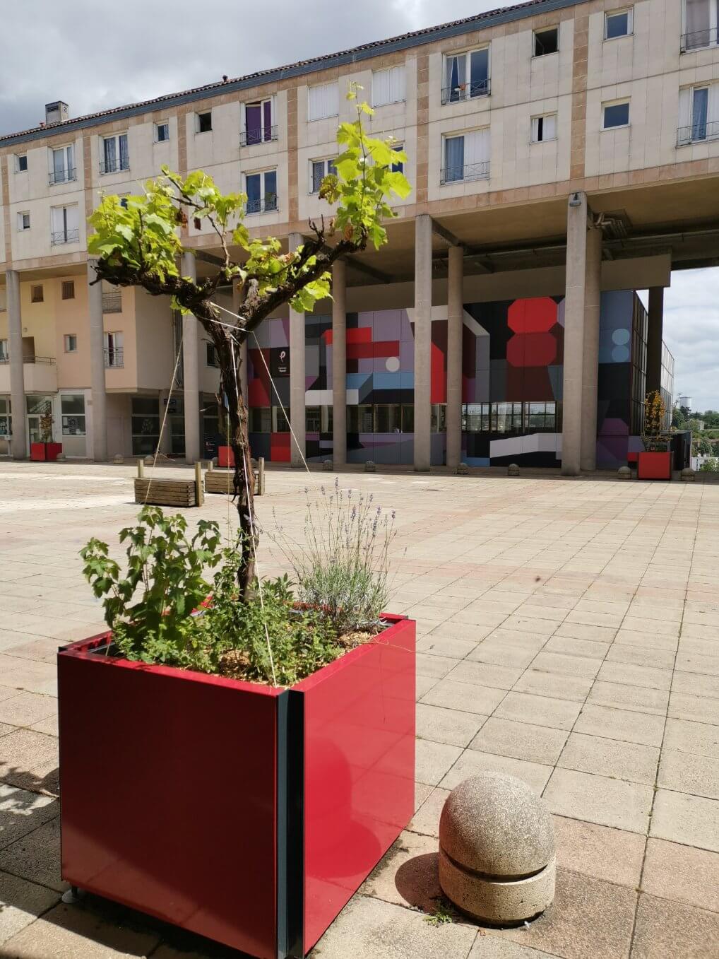 Une touche d’originalité vient compléter l’ensemble avec les bacs à fleurs rouges, sans découpe, installés dans la cour de la Résidence de Blossac, face au gymnase.