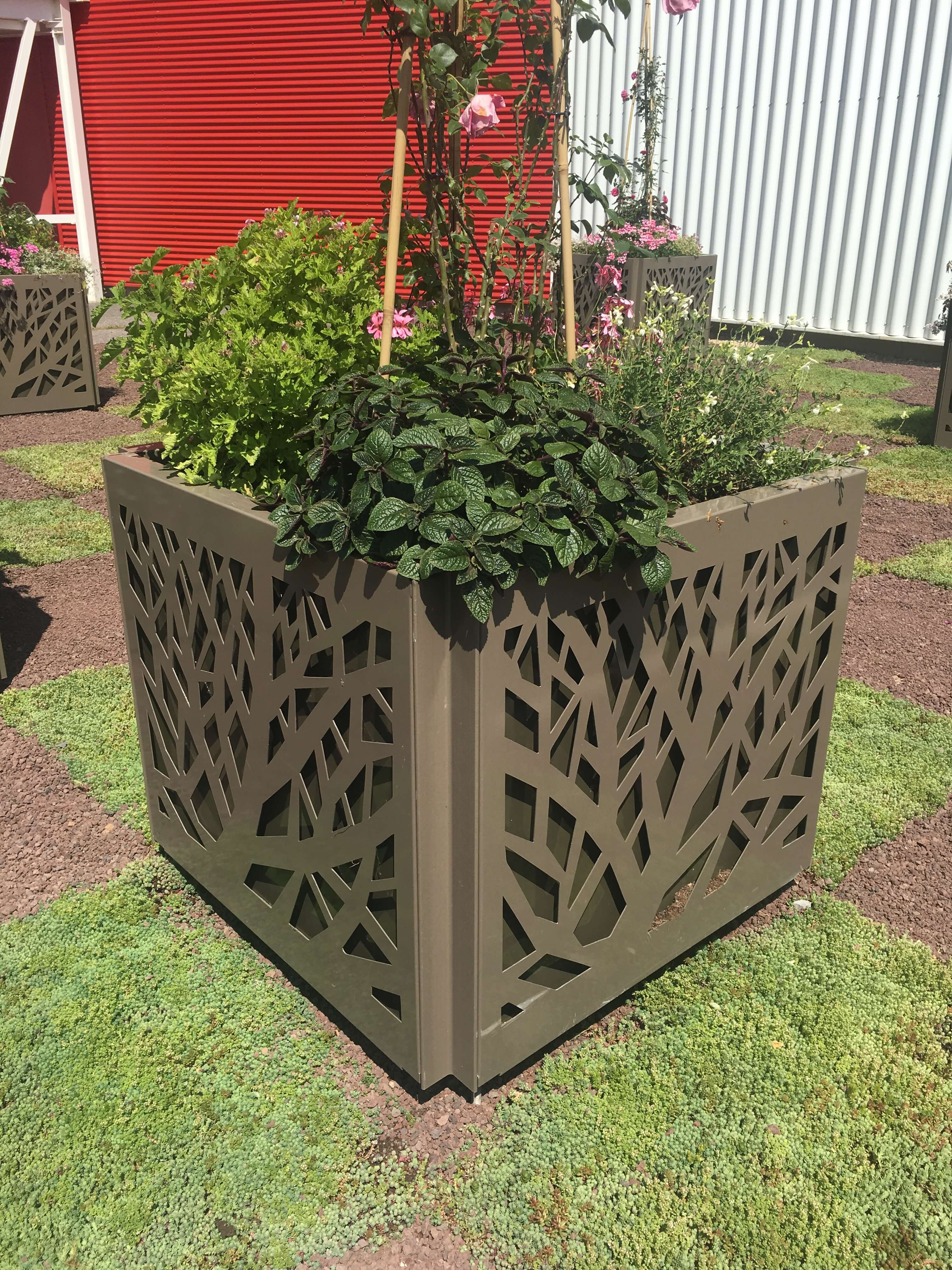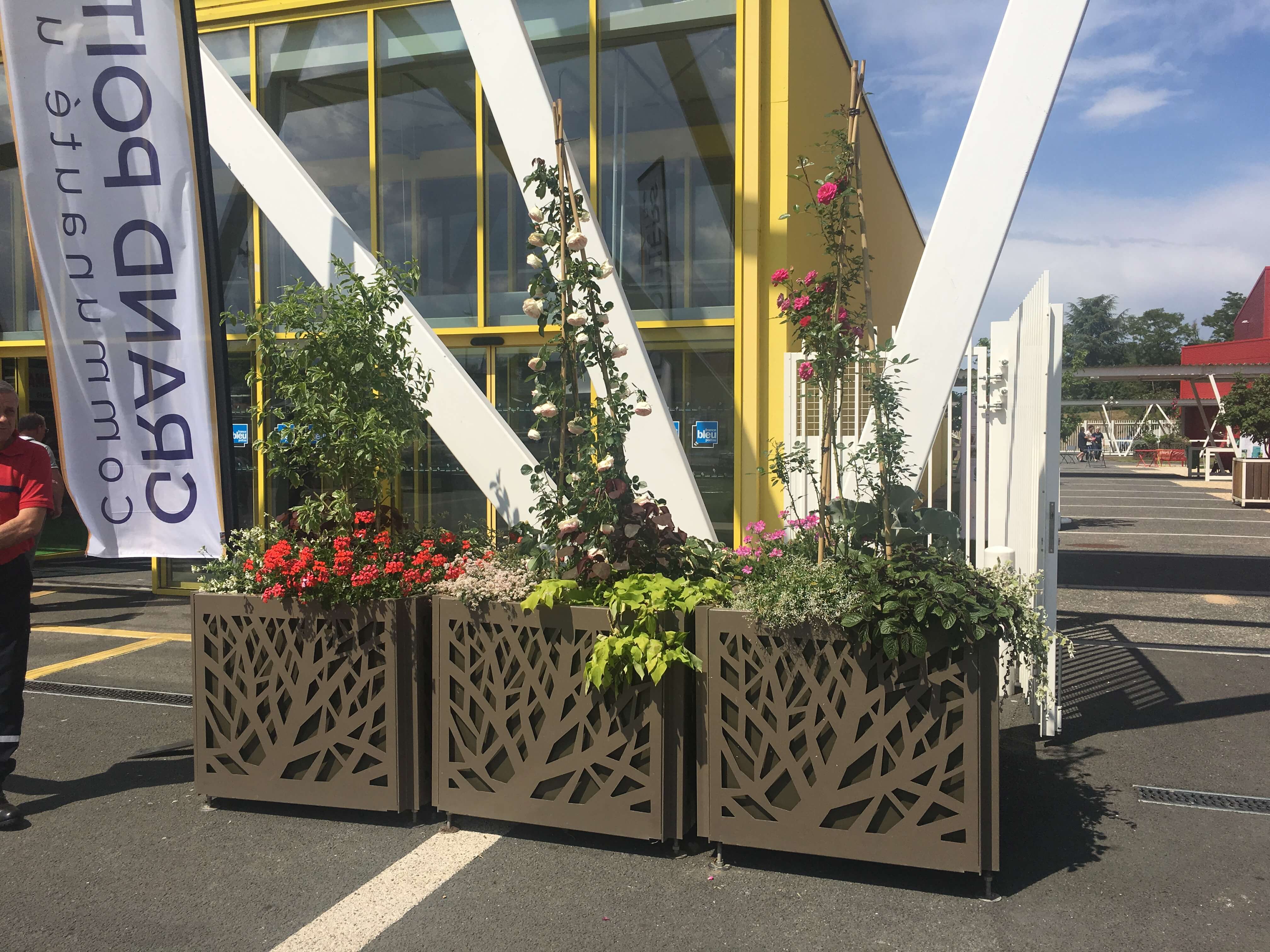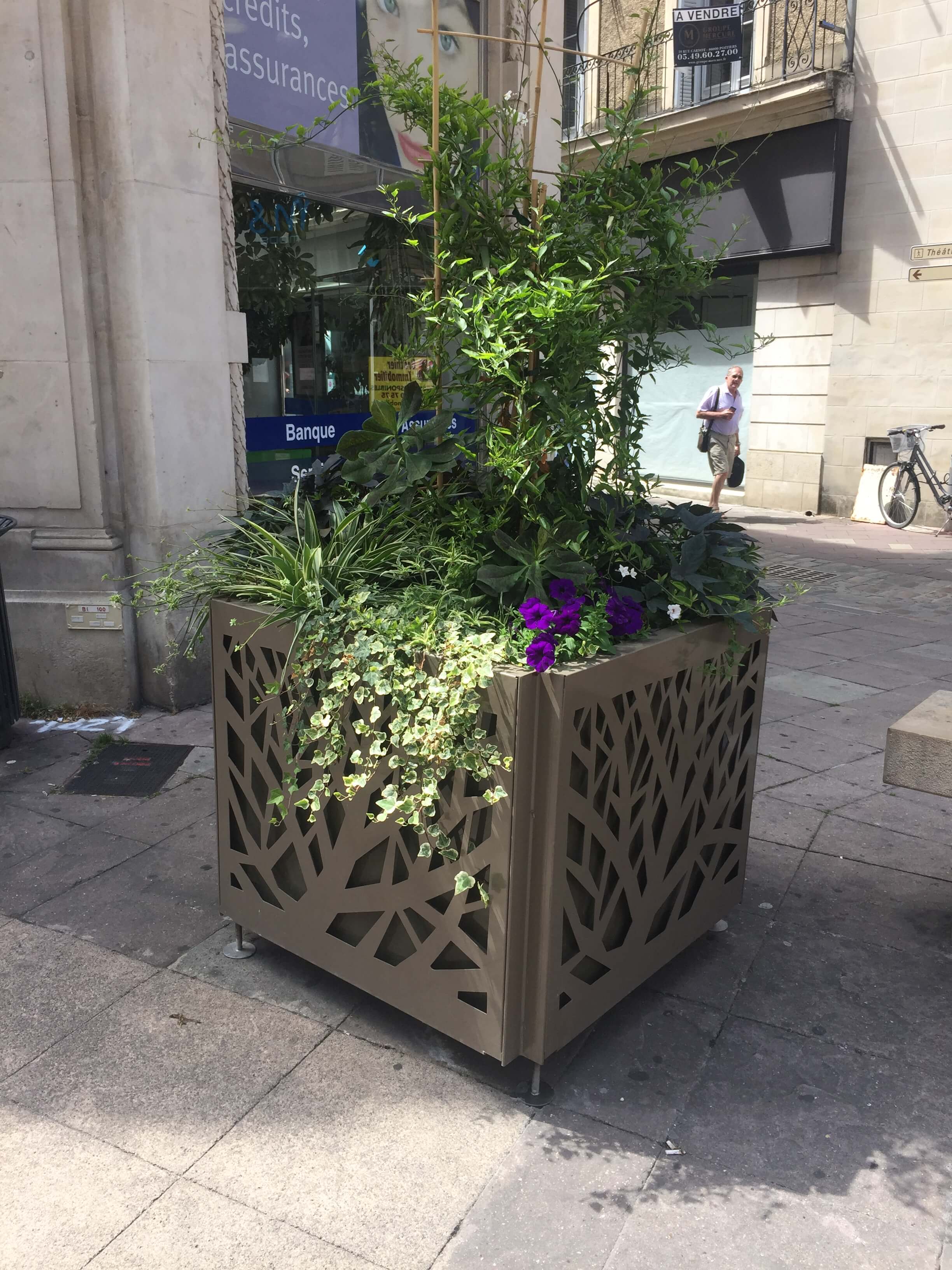 Conçues en acier découpé selon la charte graphique de la ville, ces jardinières se distinguent par leurs feuilles ajourées au laser, offrant un jeu de profondeur subtil grâce à la tôle placée en arrière-plan.