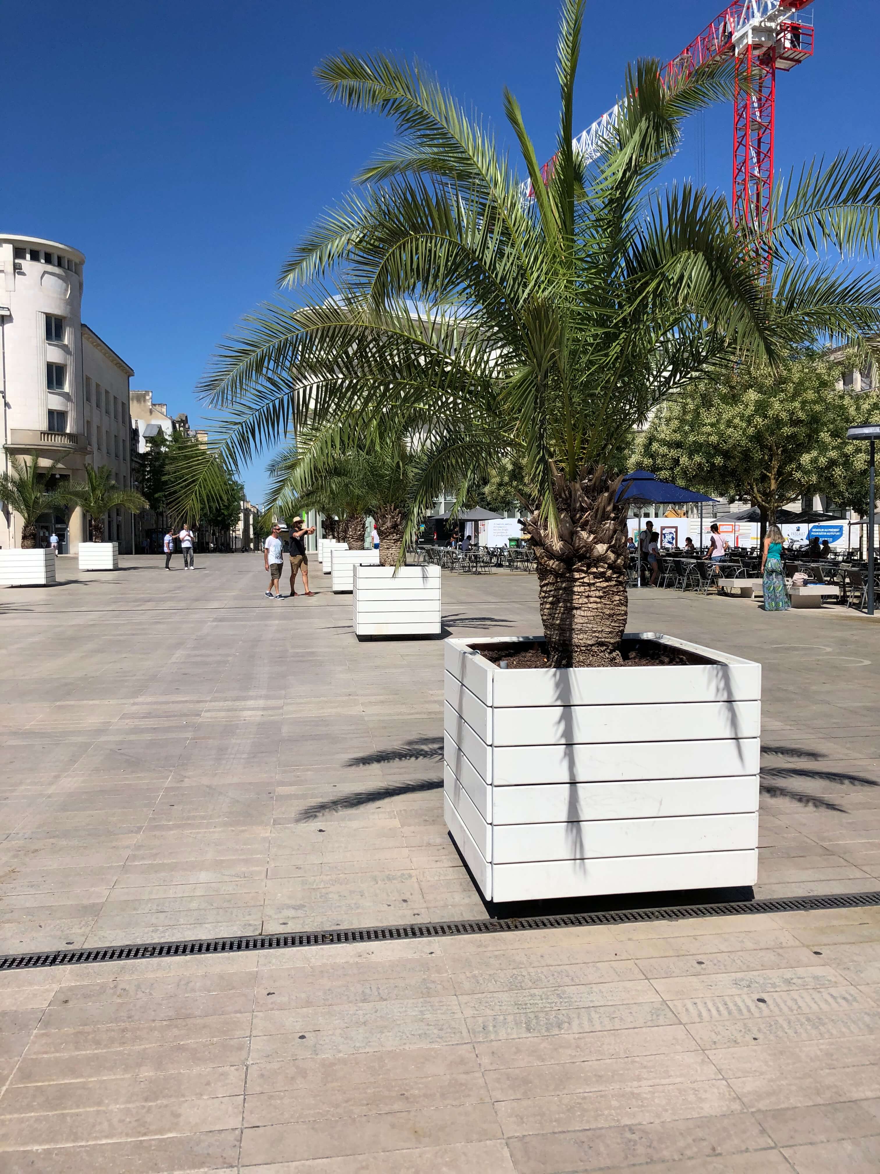 En complément, la ville a également opté pour des bacs en chêne aux lames peintes en blanc, accueillant chaque été les palmiers emblématiques de Poitiers sur la Place de la Mairie, anciennement Place d’Armes. On les retrouve également Place de l’Ancien Palais de Justice, alignés avec élégance et majesté.